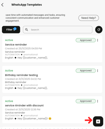 1. Go to Marketing-> WhatsApp Templates -> Click '+' to create new template.