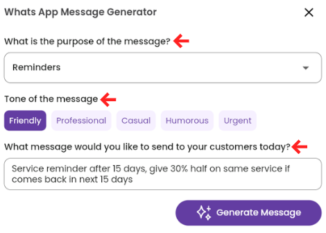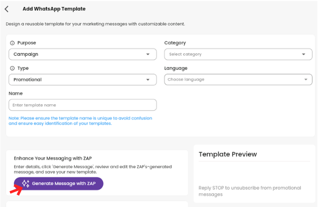 ZAP AI allows you to quickly generate WhatsApp templates using AI-powered prompts. This feature helps you create accurate, ready-to-submit templates within seconds and offers proof reading, saving time and ensuring quality. Since it is a credit-based feature, you can purchase additional credits from the Marketing section whenever needed.