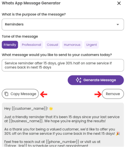 Eample: Create a WhatsApp template for a service reminder that is sent to the customer after 15 days, informing them to visit the store and get 30% off on the same service within the next 15 days.