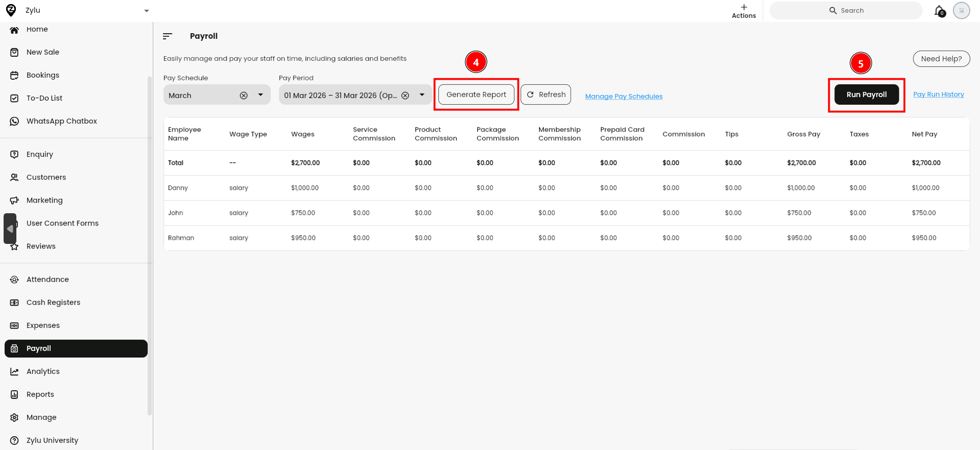Update and review employee compensation before running payroll to ensure accurate salary calculations. Steps Go to Manage Click Staff Management Select the staff member Click the three dots (⋮) → Edit Switch to Compensation tab Update: Salary amount ...