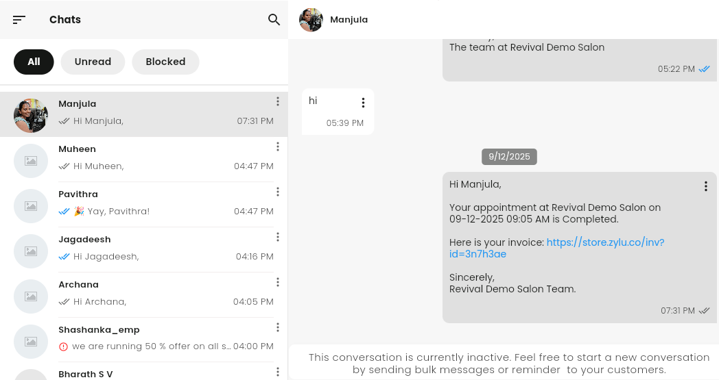 When you click Share → WhatsApp from API, An official WhatsApp template message is automatically sent to the customer’s registered WhatsApp number in Zylu.