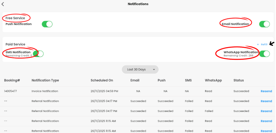 - WhatsApp Notifications: Paid WhatsApp notifications sent to customers about their bookings, invoices, offers and reminders etc. Click on Refill option to buy credits.