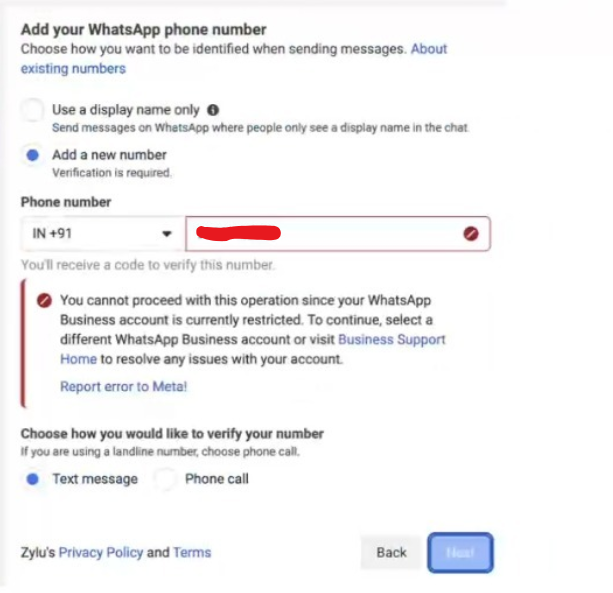 - When your Meta Facebook account or WhatsApp Business Account is under restriction, you cannot complete the phone number verification process (It will block new phone numbers also). As shown in the images, Meta blocks the setup and displays a message saying that the WhatsApp Business Account is currently restricted, preventing you from proceeding further.